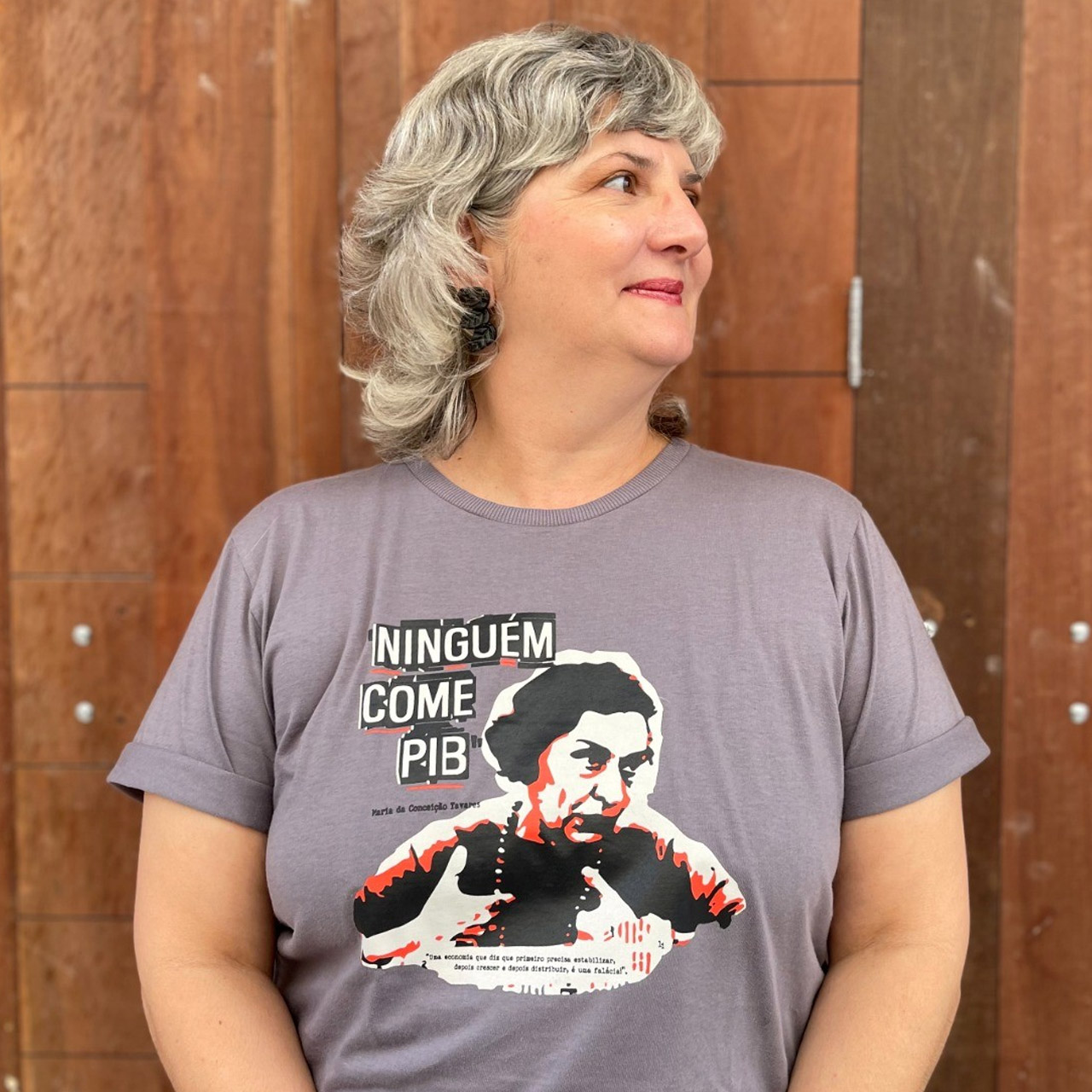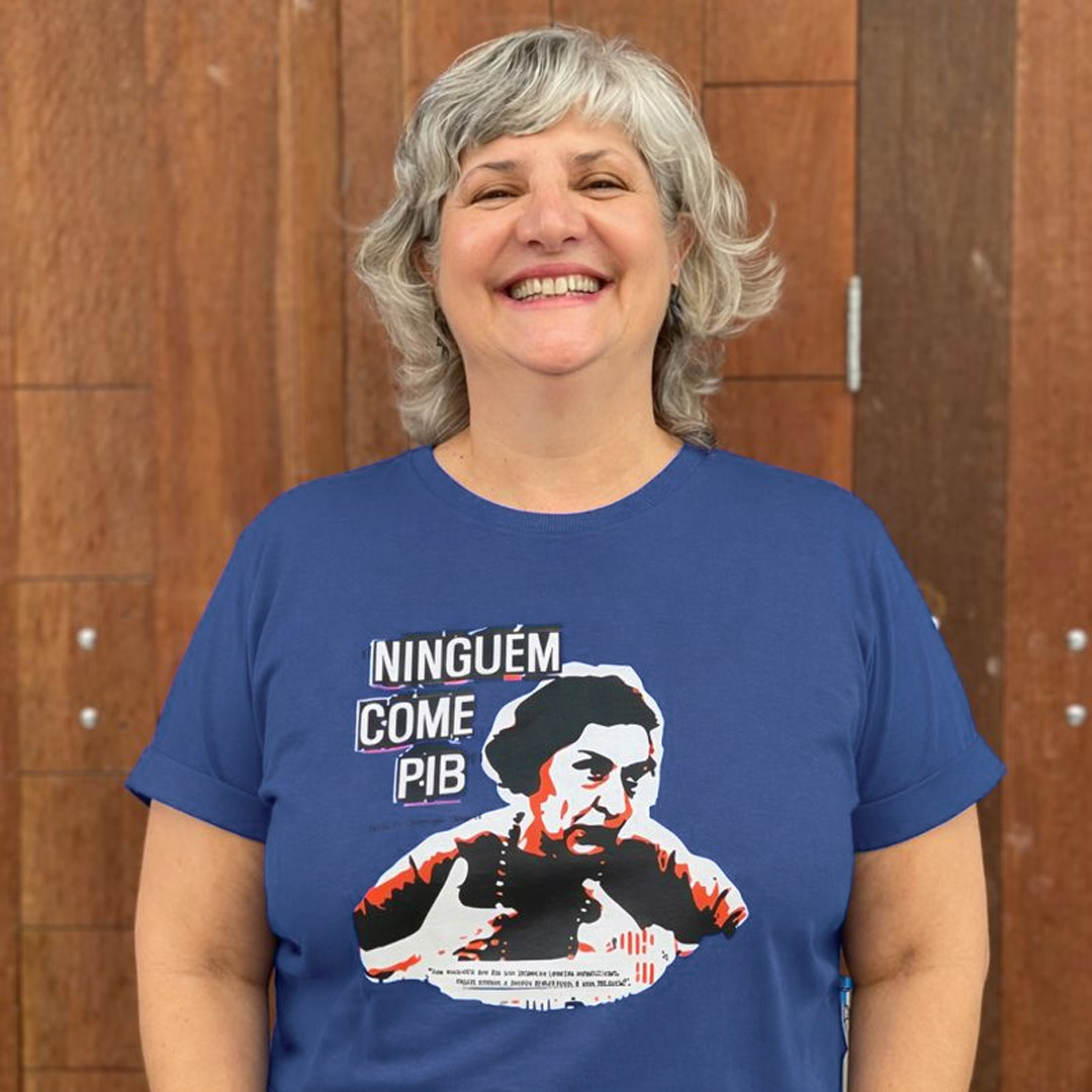 A icônica frase da economista Maria da Conceição Tavares agora ganha forma e impacto nesta estampa. Com um design no estilo recorte de jornal, essa peça traz sua imagem emblemática e a mensagem em grandes letras, como um grito contra a desigualdade e a falsa ilusão de que crescimento econômico, por si só, resolve a vida do povo.