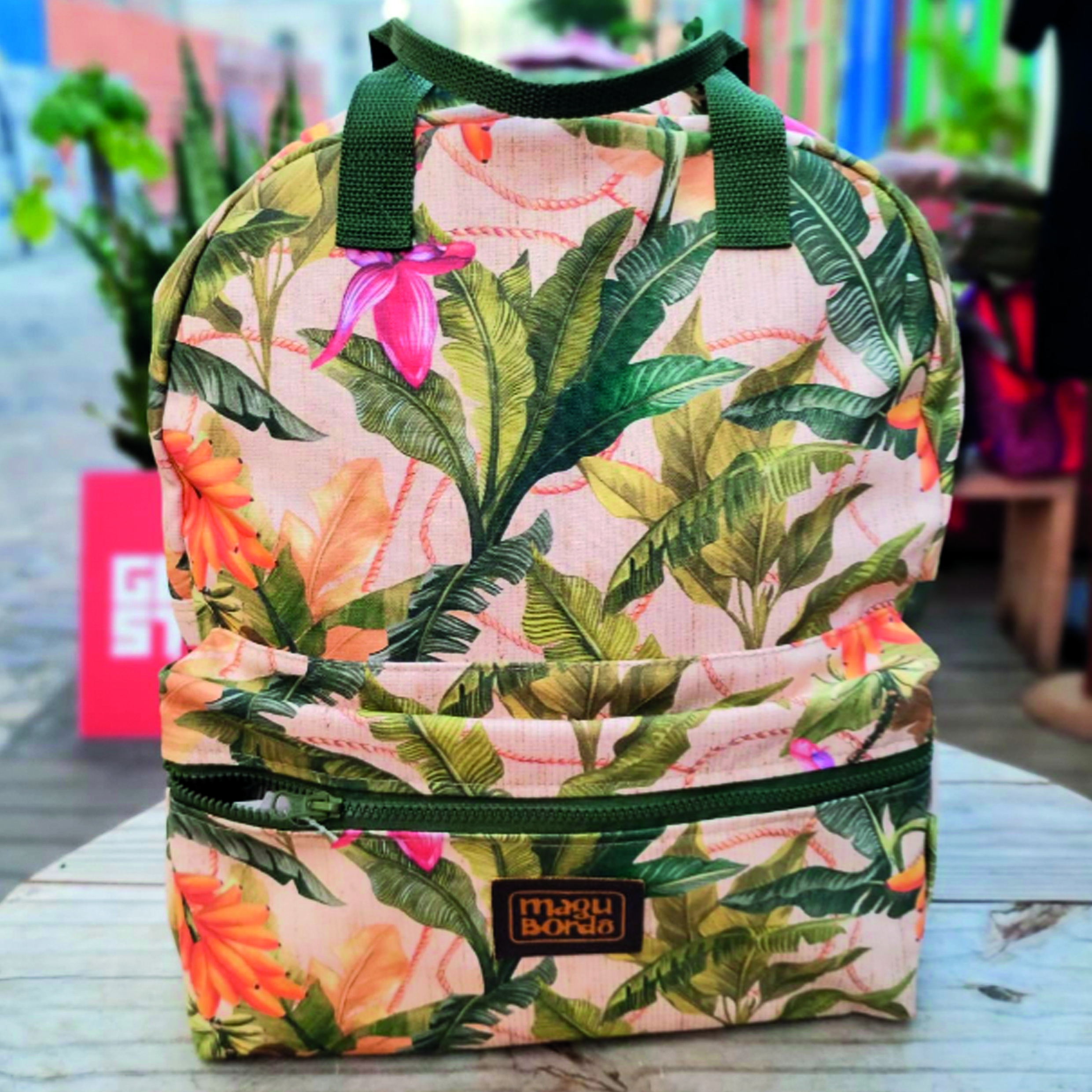 Confeccionada em lona de algodão impermeável artesanalmente, alça em algodão, ferragens e zíper em metal (variação de cores: dourado, prata e ouro velho), forro de tecidos estampados, acabamento com couro.